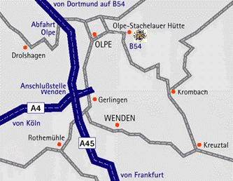 Wegbeschreibung: Gesamtstrecke von der Autobahn A45 bis zum Hundeplatz 8,2 km Ab A 45 aus Richtung Frankfurt / Köln oder aus Richtung Dortmund kommend an der Abfahrt Olpe (Abfahrt 18) die Autobahn verlassen und am Ende der Abfahrt nach links abbiegen. Der B 54 in Richtung Kreuztal ( 4 km ) folgen. Dann nach links einordnen Richtung Rhode / Kreuztal B 54. An der Ampel nach rechts einordnen und abbiegen. Weiterhin dem Straßenverlauf folgen bis zum Möbelhaus Bald (7,5 km ). Bei km 7,7 nach links in Richtung Neuenkleusheim einordnen und abbiegen. Auf der rechten Seite befindet sich das Firmengebäude SiBo Verpackungen Werk 4. Unmittelbar hinter dem Firmengebäude nach rechts abbiegen (wie auf das Firmengelände), anschließend links den Berg hoch und bis zum Ende des Platzes fahren ( 500 m ). Der PSK- Alternative: Von der A4 oder der Hüttentalstrasse B54: Die Autobahn A4 geht an Ihrem Ende in die B54 Hüttentalstrasse über. An dieser Stelle ist die Ausfahrt Krombach. In der Ausfahrt Krombach und bei dem Kreisel nach ca. 2 km in Richtung Olpe fahren. Der B54 durch Altenkleusheim folgen bis zur rechten Abzweigung nach Welschen Ennest / Neuenkleusheim (bei dem Firmengebäude SiBo Verpackungen Werk 4 - Unmittelbar hinter dem Firmengebäude nach rechts abbiegen (wie auf das Firmengelände), anschließend links den Berg hoch und bis zum Ende des Platzes fahren ( 500 m ). Der PSK- Wir wünschen Ihnen eine angenehme Anreise. |