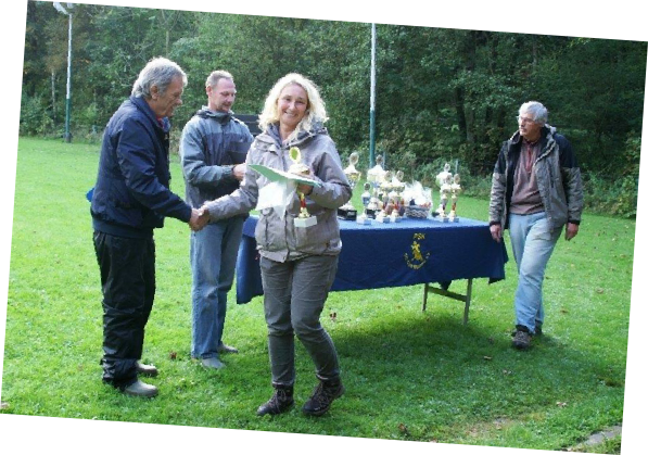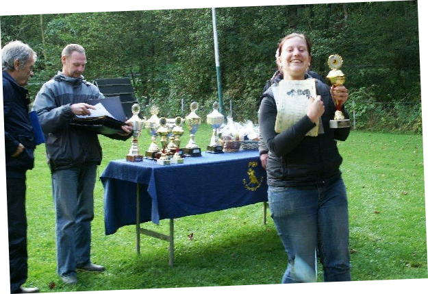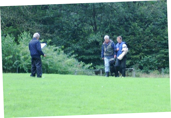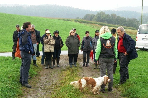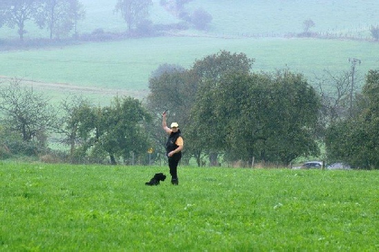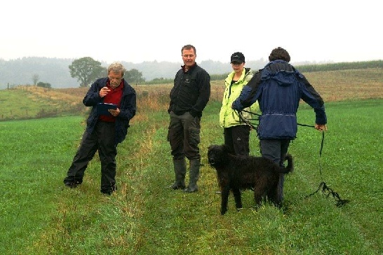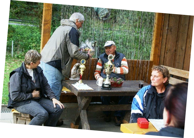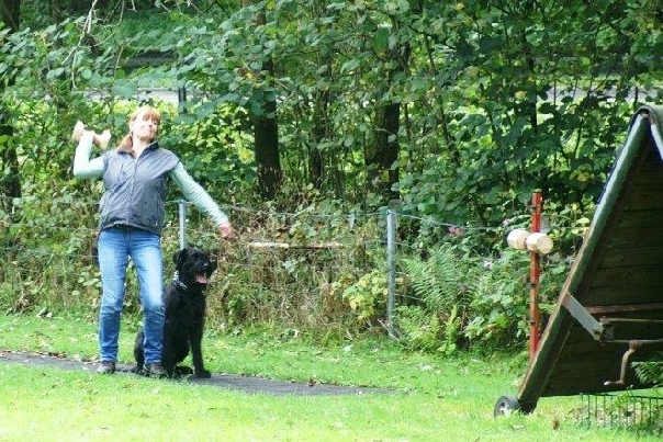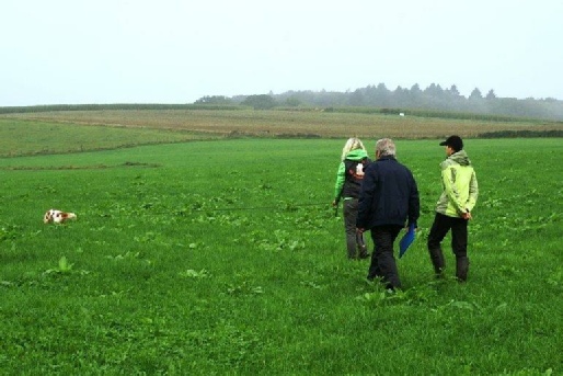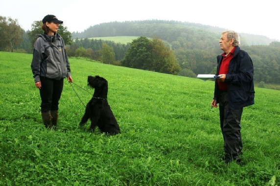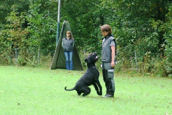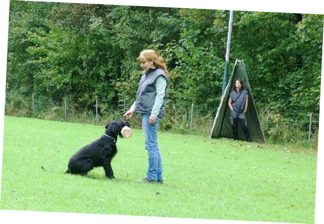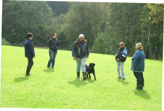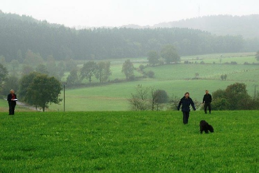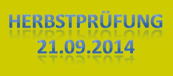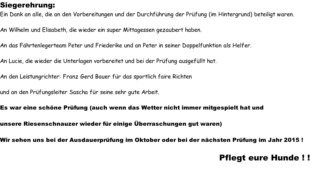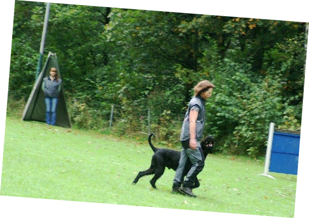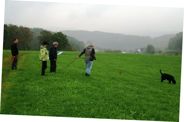 Aktualisiert  22.09.2014 Nach einer schönen Woche versprach der Wetterbericht starke Schauer  und eine Regenwahrscheinlichkeit von 99 %.  Der Wetterbericht hatte leider recht. Even und Anja suchten die erste Fährte des Morgens. Leistungsrichter Franz Gerd Bauer und die Fährtenleger Peter Templin  und Friederike Welter weisen Jolly und Ralf zur Fährte für die IPO 3 ein. Aisha mit Dieter und Barack mit Martina suchen ebenfalls  die Fährten für die IPO 3. Ella und Kirsten vor   dem Start zur FPr 3. Annika und Andrea bei der FH 1 am 1. Gegenstand. Aber dann kam der Regen.  Es goss in strömen und die Kamera musste eingepackt werden.   Aber trotz der Wetterumstände haben Ajax mit Ulli und Becky mit Lena   Ihre FH 2 erfolgreich abgesucht. Der Freudensprung von Junas Tochter Mahra ist berechtigt.  Auch sie suchte mit Lucie eine „vorzügliche“ Fährte. Barack und Martina zeigten eine „sehrgute“ Unterordnung. Anna mit Ulli bei der ersten FPr 1  Eine „vorzügliche“ Fährte. Juna mit Ihren 10 Jahren  zeigt dem Nachwuchs mit  99 Punkten wie man eine   FPr 3 suchen muss. Nach dem von Wilhelm und Elisabeth zubereiteten, vorzüglichen   Mittagessen hatte sich das Wetter wieder beruhigt und es   zeigten sich bei der Unterordnung zur IPO 3 sogar einzelne   Sonnenstrahlen. Bruno und Kerstin als „Blindenhund“.   Da kann man auch Mal unkonventionelle Wurftechniken ausprobieren. Jolly bei der „kurzen Flucht“. Aisha, Dieter und der Schutzdiensthelfer Peter Templin beim  Seitentransport zum Leistungsrichter Franz Gerd Bauer Spass muss sein ! !   Nach der verregneten FH 2 belohnt Lena Becky   mit der Arbeit auf dem Platz und dem Beißkissen    während die Unterlagen vorbereitet werden.