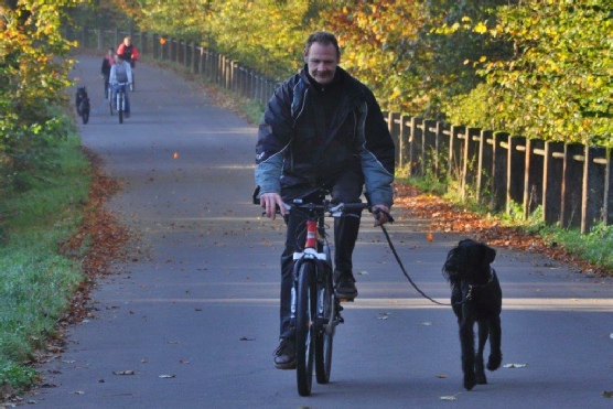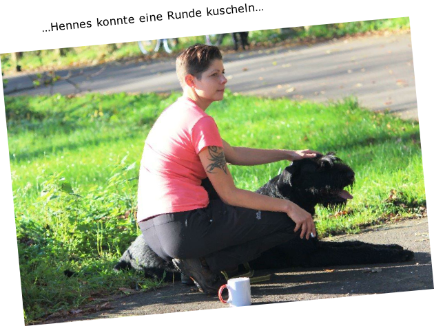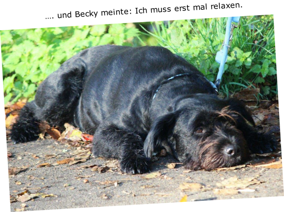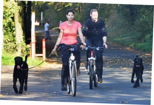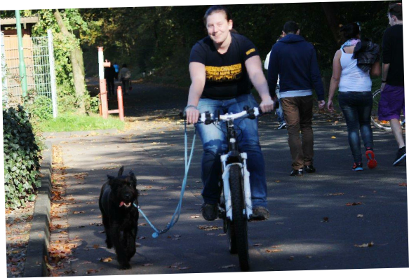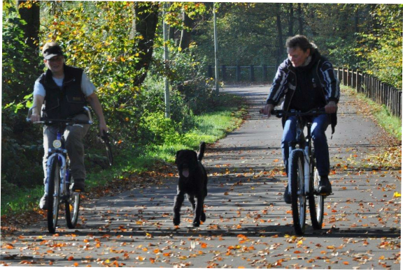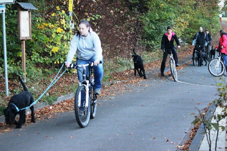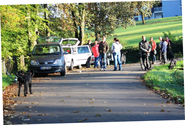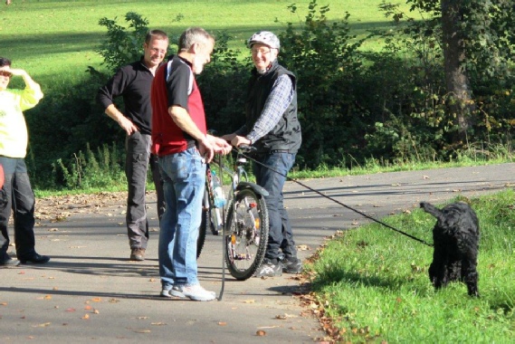 Aktualisiert  20.10.2014 Die Sonne schaute schon über den Horizont, als sich die vier Teams   der Ausdauerprüfung zusammen mit der Leistungsrichterin Ulrike Hohoff  um 8:30 Uhr beim Hallenbad zum Start aufstellten. Baila mit Sascha kamen als erste an der Pausenstation   in Stade an. Becky mit Lena und Hennes mit Friederike   folgenden hinterher. Branca mit Andrea hatten es etwas   langsamer angehen lassen. Nun gab es die erste Pause und die Pfoten der  Hunde wurden auf Verletzungen überprüft. Jeder gestaltete die Pause auf eigene Weise:  Branca hatte alles im Blick… … …Baila sagte: Wo geht hier was… Branca und Andrea waren gerade zur letzten Etappe   gestartet, da kam Dieter und Olf bei seiner Sonntagstour   an der Pausenstation vorbei. Da musste natürlich erst einmal geplaudert werden ! Ankunft am Ziel der Ausdauerprüfung.  Inzwischen strömten die Spaziergänger und   das Fahrradfahren mit Hund wurde schwierig. Alle haben die Ausdauerprüfung bestanden  und nach einem leckeren Mittagessen beim Vereinsheim  wurde auch noch der Übungsbetrieb gemacht.